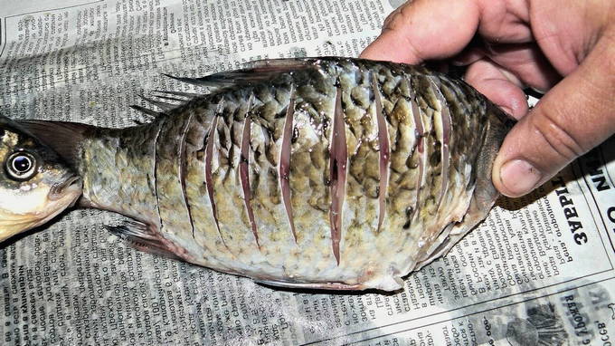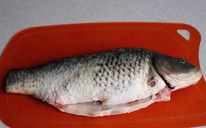 - Schil de karper van binnen, trim de vinnen en staart, spoel af, bestrijk de binnen- en buitenkant met een mengsel van zout, peper en koriander. Maak diepe sneden in de huid.