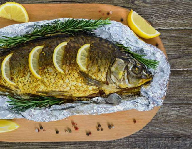 Gegrilde karper in folie wordt gekookt zonder toevoeging van olie. Het tomatensap dat in de marinade wordt gebruikt, neutraliseert de specifieke geur van riviervis, terwijl olijven, aromatische kruiden en specerijen de vis een aangename mediterrane smaak geven.