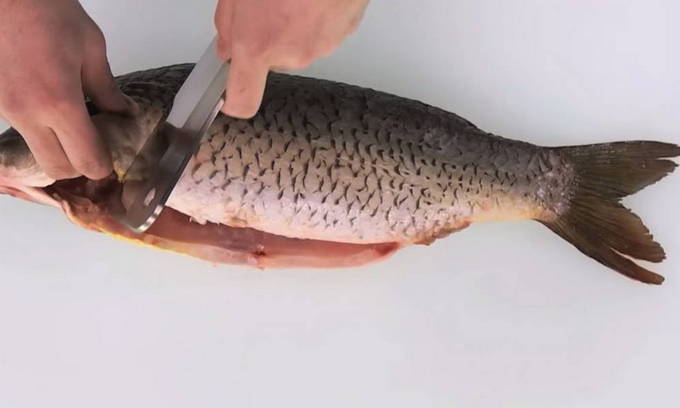 - Schil de karkassen van de vis van de binnenkant en de schubben, verwijder de vinnen en de staart, was de binnenkant en de buitenkant, droog af met keukenpapier, snijd in de huid, maar snij niet in de rug.