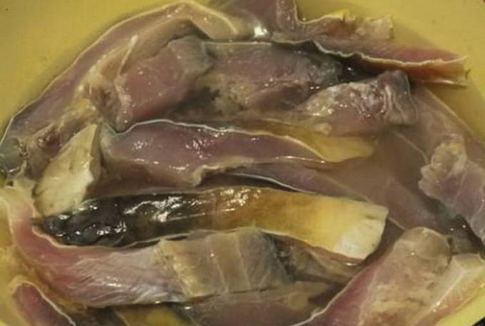 - Vet stukjes vis in met een massa, leg ze in een diepe kom en giet de rest van de marinade erover, laat ongeveer een half uur staan.