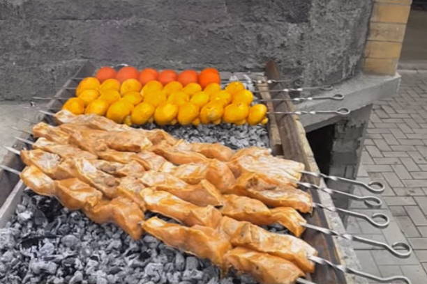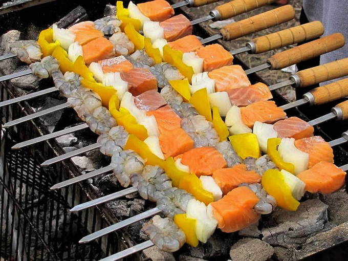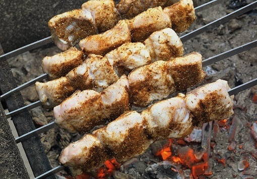 - We bakken de kebabs op de kolen, draaien ze regelmatig een paar minuten, tot ze aan alle kanten bruin zijn. Serveer met yoghurtsaus en verse kruiden.