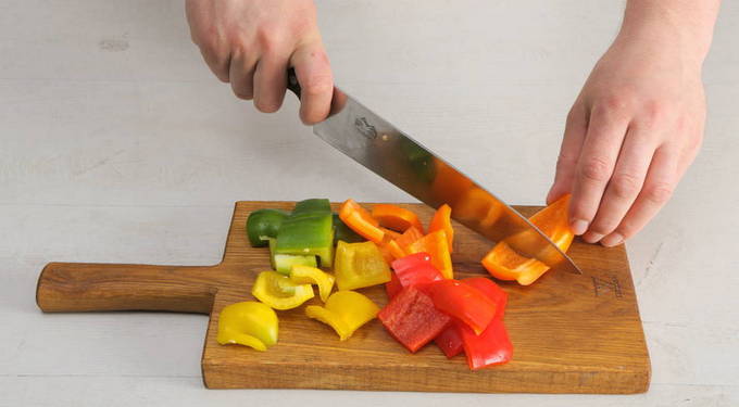 - Peperzaden worden verwijderd en in kleine stukjes gesneden ter grootte van een viskebab. We rijgen afwisselend stukjes vis, olijven, tomaten en paprika's aan spiesjes.