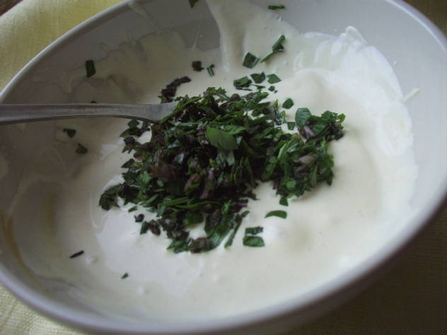 - Hak de greens fijn en meng met zure room, voeg indien nodig peper en zout toe, giet de zure roomsaus over de vis.
