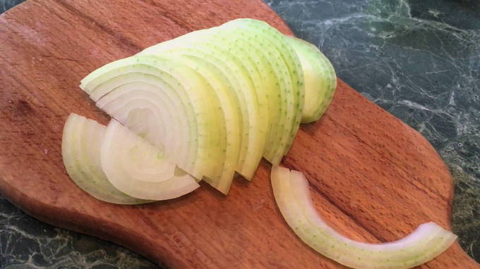 - Snijd de ui in ringen en doe deze in de karper en kroeskarper.