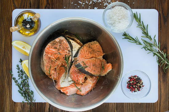 Bestrooi de stukjes vis met zout, een mengsel van versgemalen peper, bestrijk met olijfolie en besprenkel met het sap van een halve citroen. Dek de steaks af met plasticfolie en laat 10-15 minuten marineren.