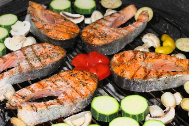 - Serveer roze zalm gebakken op kolen, verdeel het in porties, met gegrilde groenten of gemengde salade.