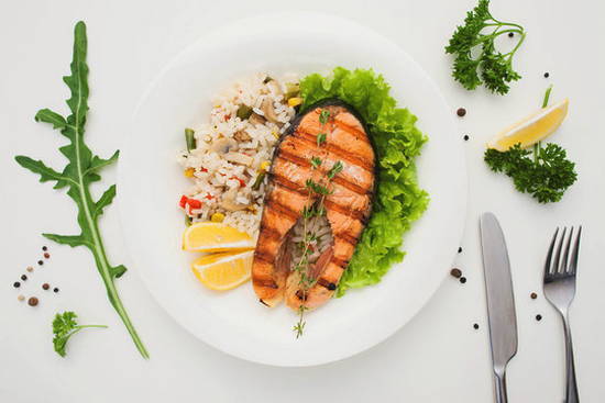 Gegrilde rode vissteaks worden geserveerd met kruiden, verse groenten en een halve citroen. Genieten van!