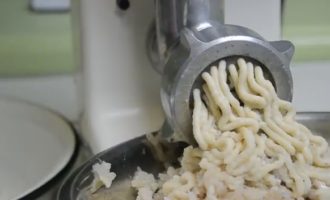 - Hak snoekvlees gescheiden van de zaden samen met uien in een blenderkom of in een vleesmolen.