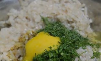 - Klop een ei door het gehakt, voeg geperst brood, gehakte kruiden, gekookte rijst toe en bestrooi met kruiden en zout naar smaak.