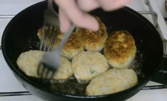 - Bak de pasteitjes 3-4 minuten aan elke kant in hete zonnebloemolie. Om de schnitzels goed te bakken, is het raadzaam ze meerdere keren om te draaien.