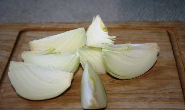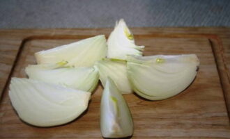 Pel de ui en snij in grote stukken.