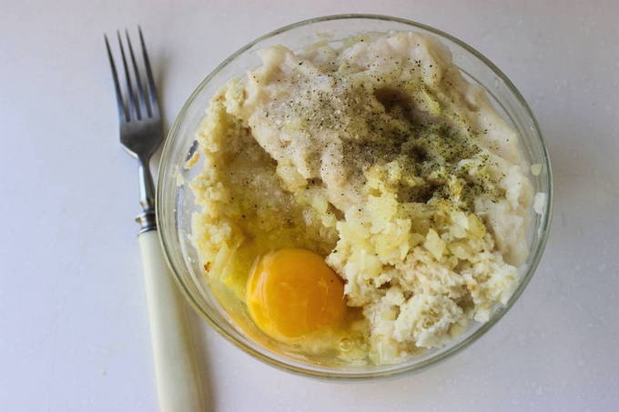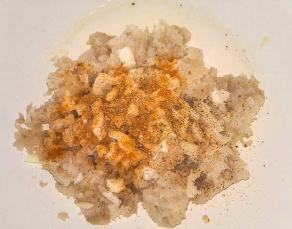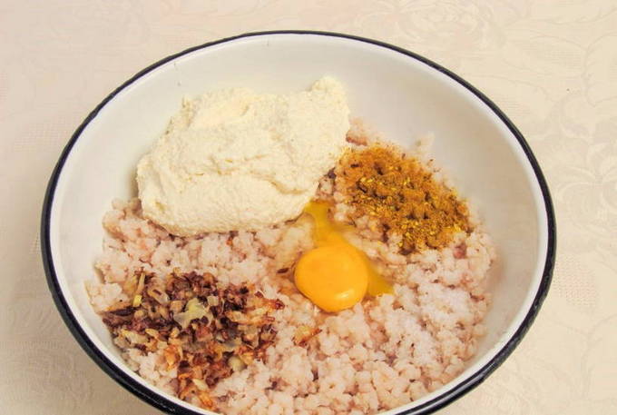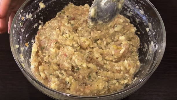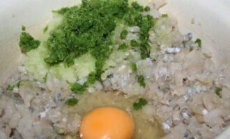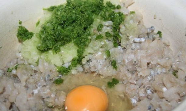 - Voeg de dooier, gebakken uien, zout en peper toe aan de gehakte vis. We mengen alles grondig en sturen het 20 minuten naar de koelkast zodat het brood helemaal opgezwollen is.