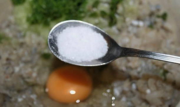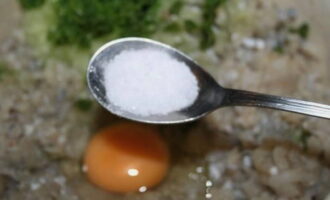 - Nu breken we het ei in het gehakt, zout, voeg peper en gedroogde peterselie toe.