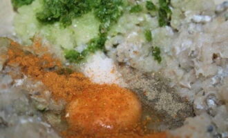 - Voeg zout en viskruiden toe. Pel de knoflook en hak fijn met een mes of haal door een pers. Voeg het toe aan het gehakt en meng alles goed tot een glad beslag. We kunnen beginnen met het vormen van koteletten.