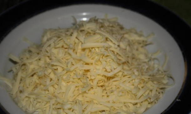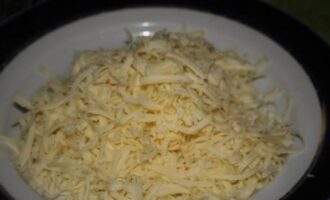 Rasp, terwijl de schnitzels bakken, de kaas op een grove rasp. Het is beter om zachte kaas te gebruiken, omdat deze beter smelt.