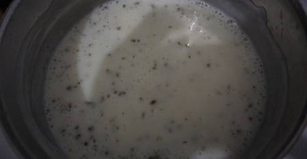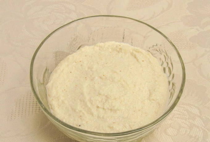 - Giet griesmeel in een geschikte container en vul deze met warme kefir. Roer alles goed door elkaar zodat er geen klontjes ontstaan. We vertrekken gedurende 30 minuten, totdat het griesmeel opzwelt.