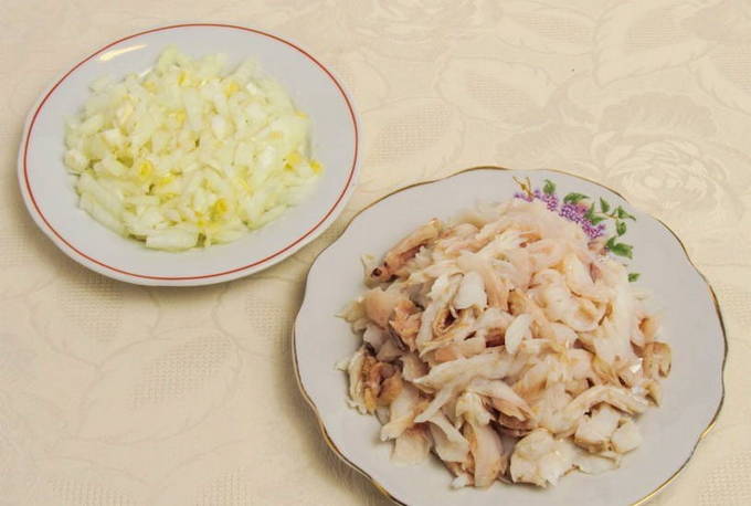 - Scheid de kabeljauwfilet van de botten en verwijder het vel. We wassen de vis goed. Snijd de filet in middelgrote stukken. Pel de ui en hak fijn.