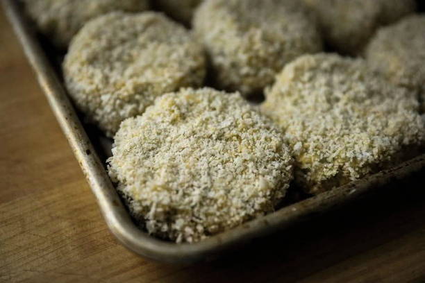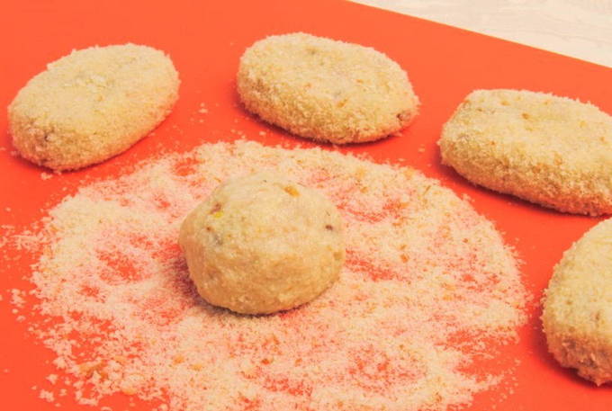 - Giet de broodkruimels op een snijplank. Vang met een eetlepel het gehakt op en vorm er een balletje van. Bedek het met paneermeel en vorm vervolgens de kotelet.