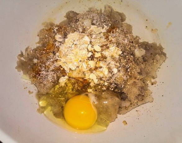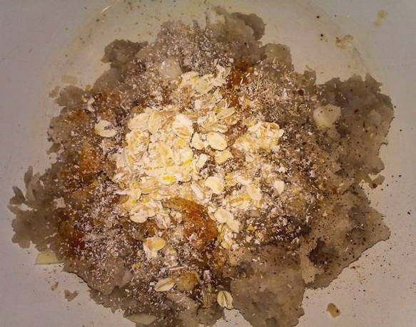 - Breek het ei in het gehakt en meng goed. Laat hem staan om de zemelen te weken met havermout.