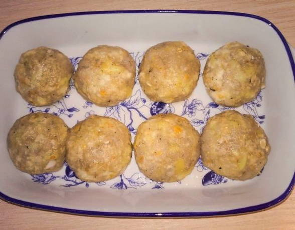 Voor gehakt hebben we kabeljauw, ei, ui en griesmeel nodig, dat enige tijd in warme kefir is gedrenkt. Koteletten worden in paneermeel gerold en 35 minuten in de oven gebakken.