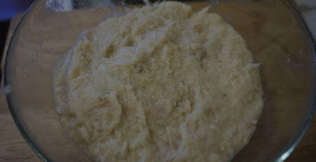- Doe het brood in een apart bakje en vul het met melk. Laat het ongeveer 5 minuten staan. Breek een ei in gehakte vis, voeg brood toe met melk, zout en peper. Mix alles grondig tot een glad geheel. Het gehakt moet een beetje waterig blijken te zijn. Hierdoor zullen de afgewerkte schnitzels sappig worden.