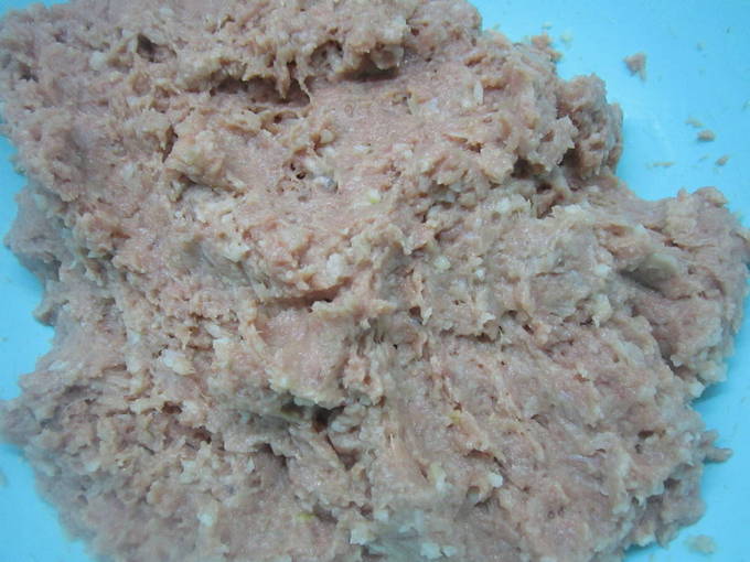- Snijd de filet in kleine stukjes. We gebruikten meerval, maar je kunt elke andere witvis gebruiken. We halen het door een vleesmolen met een teentje knoflook of hakken het met een blender.