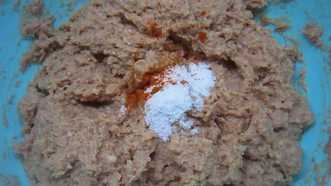 Voeg nu rode en zwarte peper, viskruiden toe en begin met het kneden van het gehakt. Je zou een homogene massa moeten krijgen. Nu beginnen we koteletten te vormen. We maken kleine taarten. We proberen ze dicht te maken, zodat ze niet uit elkaar vallen tijdens het kookproces.