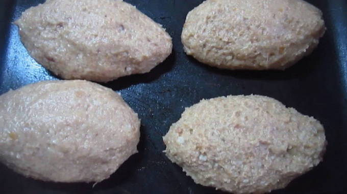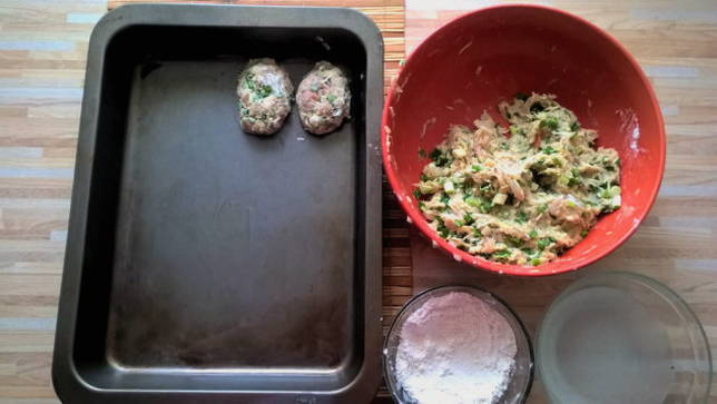 - Giet een kleine hoeveelheid water in een aparte container. We voegen ook apart een beetje bloem toe. Vet de bakplaat in met plantaardige olie. We bevochtigen onze handen in water en beginnen koteletten te vormen. Dompel ze in bloem of paneermeel en leg ze op een bakplaat.