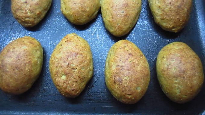 De koteletten die in de oven worden gekookt, zijn erg mals en smakelijk. Aan het gehakt worden havervlokken en roggezemelen toegevoegd, die niet alleen zijn vorm behouden, maar ook extra nuttige eigenschappen aan het gerecht toevoegen. Het bevat ook uien, zout, kruiden, een ei en wat olijfolie.