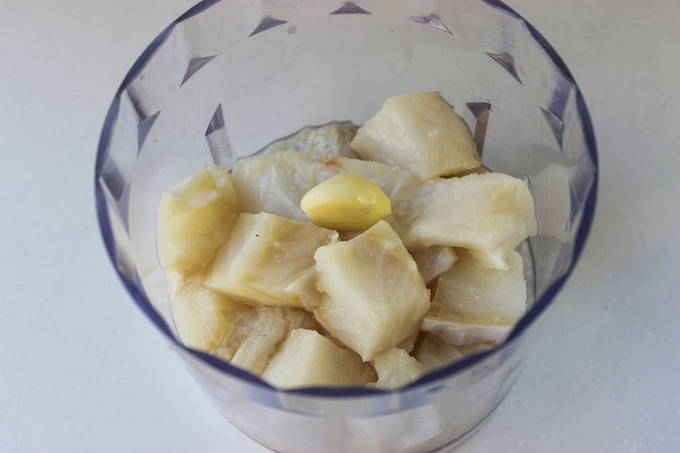 - Spoel de kabeljauwfilet grondig onder water, snij in kleine stukjes en maal met een blender of haal door een vleesmolen.