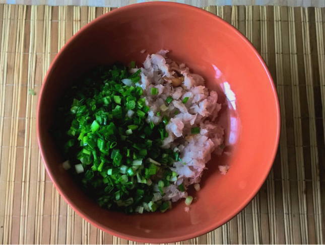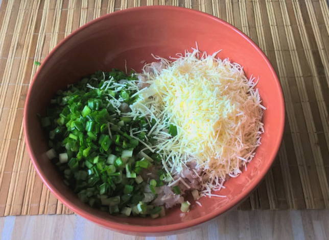 - We wassen de groene uien en hakken ze. We sturen naar de gehakte vis.