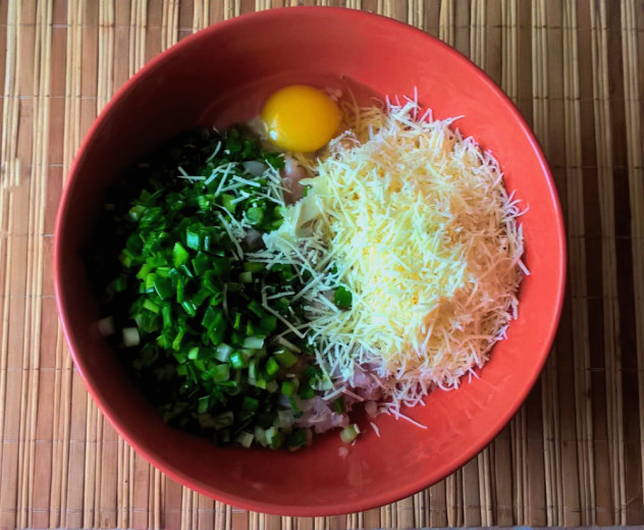 - Klop 2 eieren in een aparte kom schuimig en giet ze bij het gehakt.