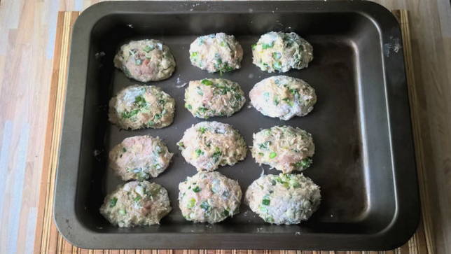 - Vet de ovenschaal in met een beetje olie. We beginnen koteletten te vormen. Vet je handen licht in met water en vorm mooie balletjes van het gehakt. We zetten ze over naar het formulier.
