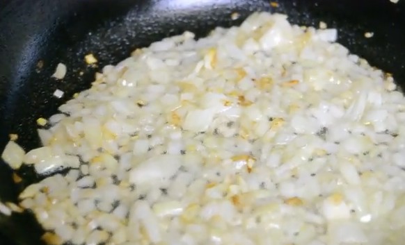 Snijd de helft van de ui in kleine stukjes en bak deze transparant in verwarmde zonnebloemolie. Het geeft de schnitzels een speciale zoetheid en smaak.