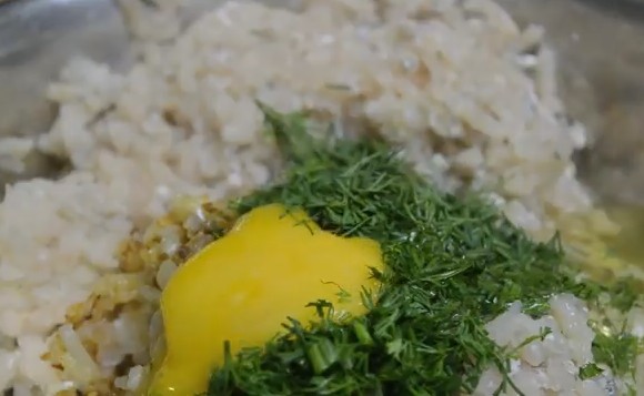 - Klop een ei door het gehakt, voeg geperst brood, gehakte kruiden, gekookte rijst toe en bestrooi met kruiden en zout naar smaak.