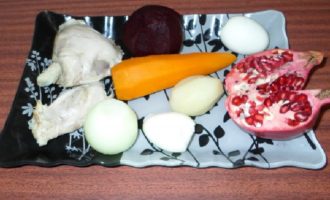 - Een eenvoudig stapsgewijs recept voor een granaatappelarmband met kip en augurken