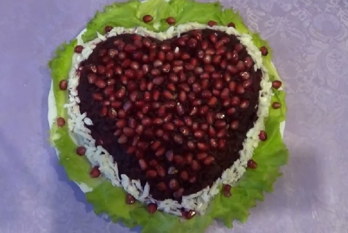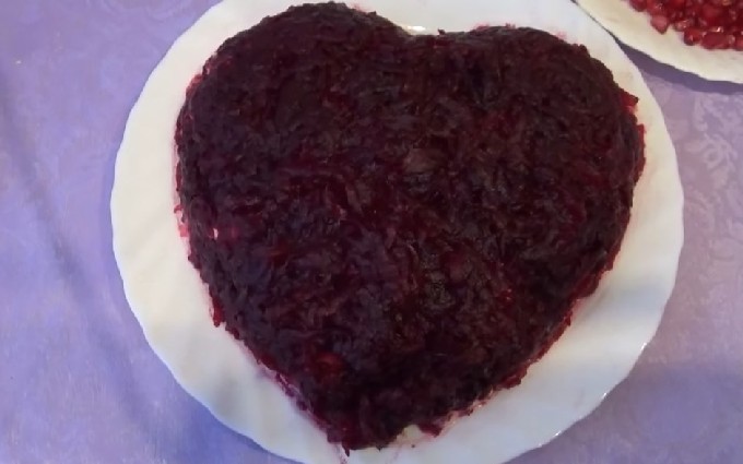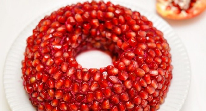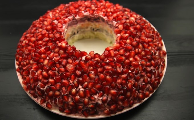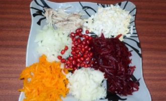 - Rasp de bieten op een middelgrote rasp. Hak de knoflook fijn.Combineer de knoflook en bieten en leg deze op de salade. We bedekken deze laag niet met mayonaise, maar strooien er meteen de granaatappelpitjes op in een zeer dichte laag. Laat 2 uur in de kou staan om te weken.