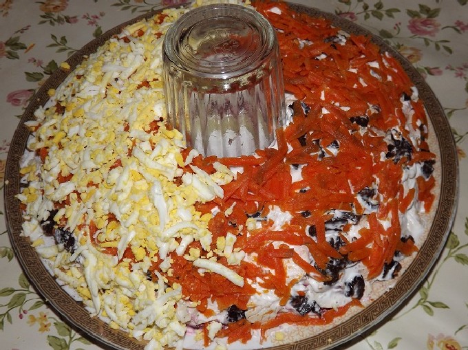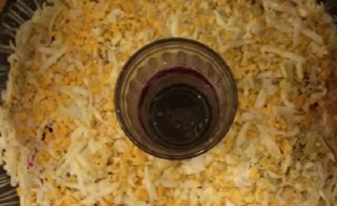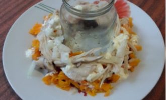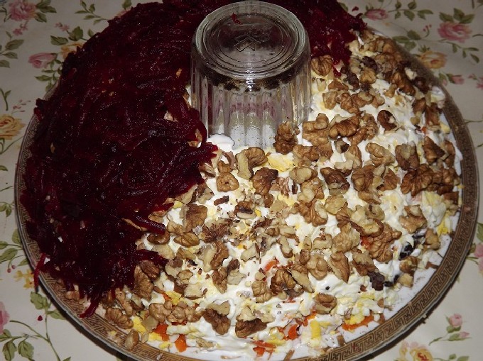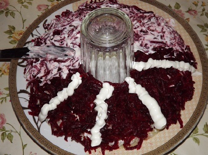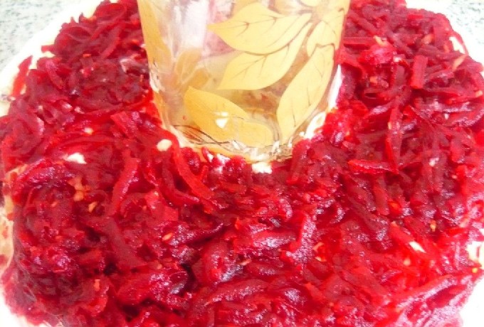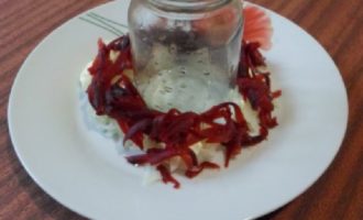 Neem een plat breed bord en plaats in het midden een pot of glas van een halve liter. Leg een laag aardappelen rond de pot, zout, peper licht en bedek met mayonaise. Leg de helft van de bieten, mayonaise erop, dan wortelen en bestrijk ze met mayonaise.