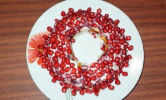 - Bedek met een royale laag mayonaise. En strooi eerst de granaatappelzaden willekeurig over het oppervlak en verwijder vervolgens de gaten, waarbij de zaden langzaam worden verspreid.