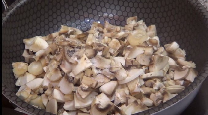 - Snijd de champignons in stukjes en bak ze op laag vuur met olie in een hete koekenpan. Demonteer de gekookte kipfilet in dunne vezels. Pel en snipper de ui met een mes. Wrijf de aardappelen grof met een rasp.