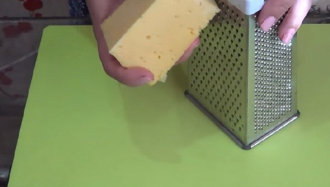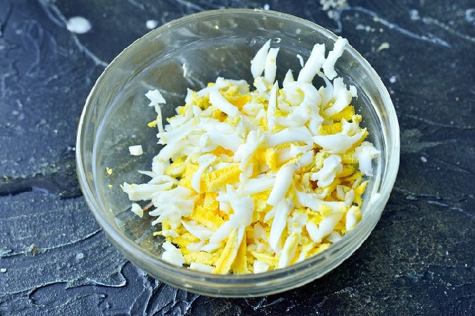 - Kook de eieren apart gedurende 10 minuten na het koken. Daarna moeten ze in ijswater worden geplaatst, zodat de schaal gemakkelijk schoon te maken is. Drie eieren op een rasp en apart op een bord leggen.