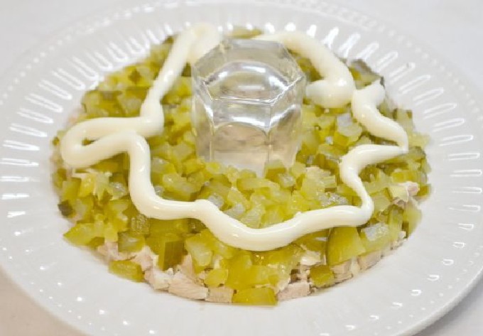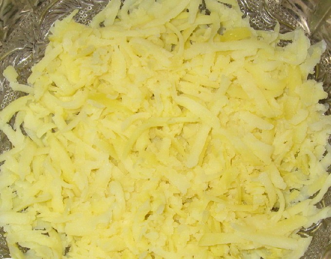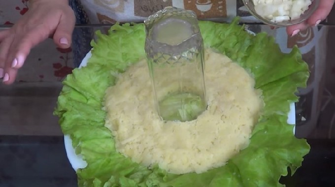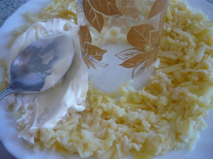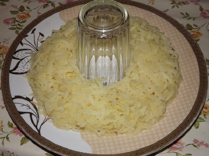 - Zet een glas in het midden van een plat bord. Rasp gekookte aardappelen en leg ze bij de eerste laag salade. Werk af met mayonaise.