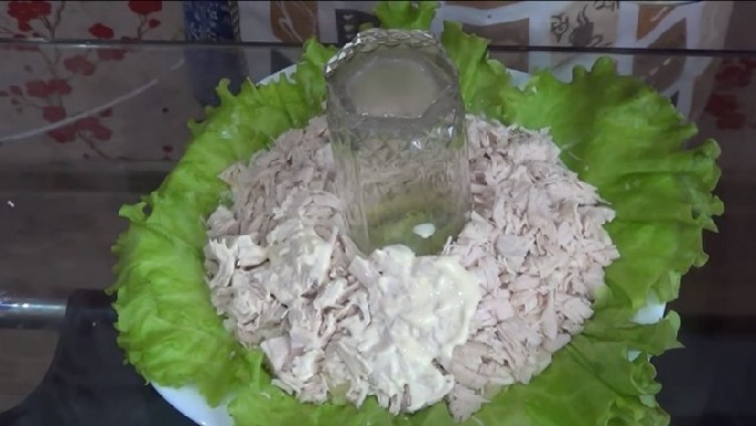 - Zet een glas op een bord, we leggen er laagjes sla omheen. Verdeel de borst in vezels en leg de allereerste, bedek met mayonaise.