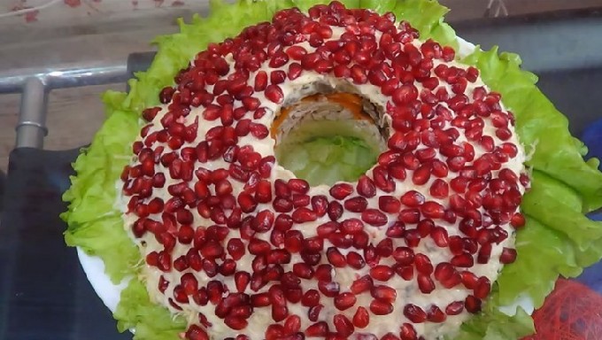 - Vervolgens - gerookte kip, gebakken uien, eieren en opnieuw een laag mayonaise. Appels, wortelen, bestrooi met noten en loop goed met mayonaise aan alle kanten, strijk de laatste laag glad. Leg de granaatappelpitjes erop en zet 30 minuten in de koelkast zodat de salade doorweekt is en de ingrediënten in één compositie spelen.