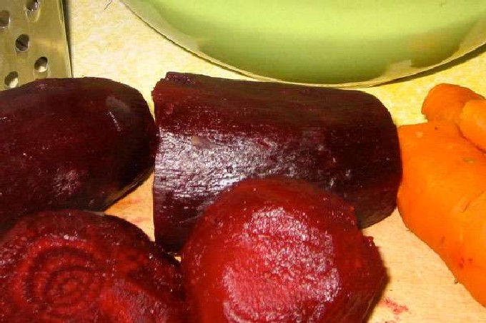 - Schil de ui en snij in vieren, breng aan de kook met kokend water en laat 5 minuten staan om de ui zachter en lekkerder te maken. Kook de eieren en passeer door een grove rasp, houd een eiwit apart voor decoratie. Kook de bieten en wrijf ze grof.