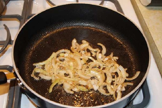 - Pel de ui, snij in vieren en snijd in dunne plakjes. Bak het in hete olie. Snijd de gerookte kip in reepjes.