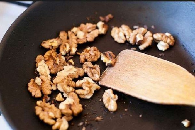- Bak de walnoten lichtjes in een droge koekenpan en hak ze fijn in een blender en bestrooi ze met de volgende laag over de salade.