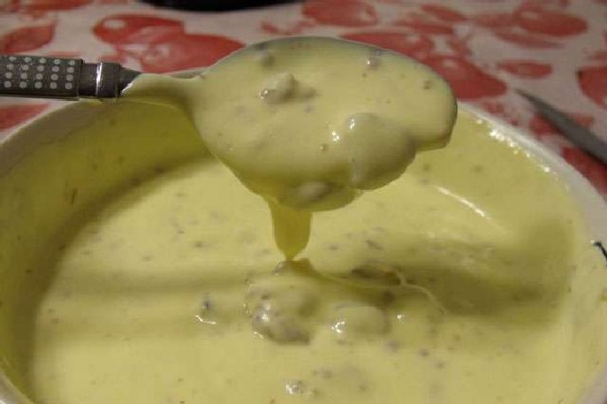 - Meng voor de dressing mayonaise met gehakte knoflook, roer en giet in een voedselzak.