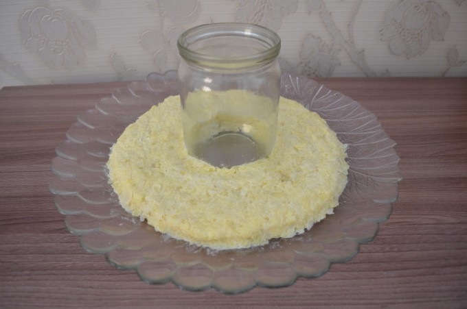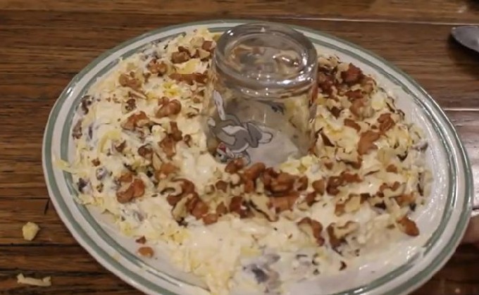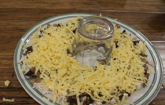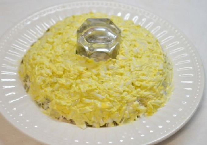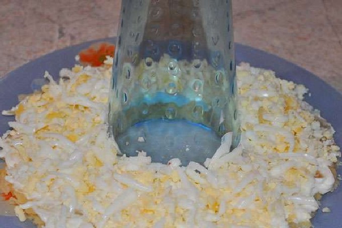- Rasp de eieren fijn op een rasp en leg ze vervolgens, druk de lagen een beetje aan met een lepel zodat de salade grijpt. Bestrooi met mayonaise en leg een laag fijn geraspte kaas. Bestrijk met de rest van de mayonaise en vorm de salade. Haal het glas uit het midden.
