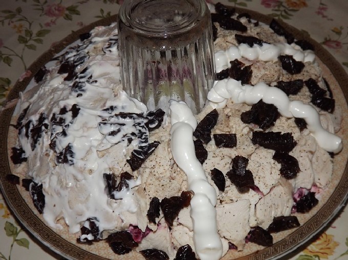 Wat zijn kip en pruimen heerlijk met elkaar gecombineerd! En zelfs bieten met granaatappels in dit bedrijf spelen met volledig unieke verfijnde smaken en sappige kleuren. Bereid deze receptsalade zeker voor de belangrijkste gelegenheid.